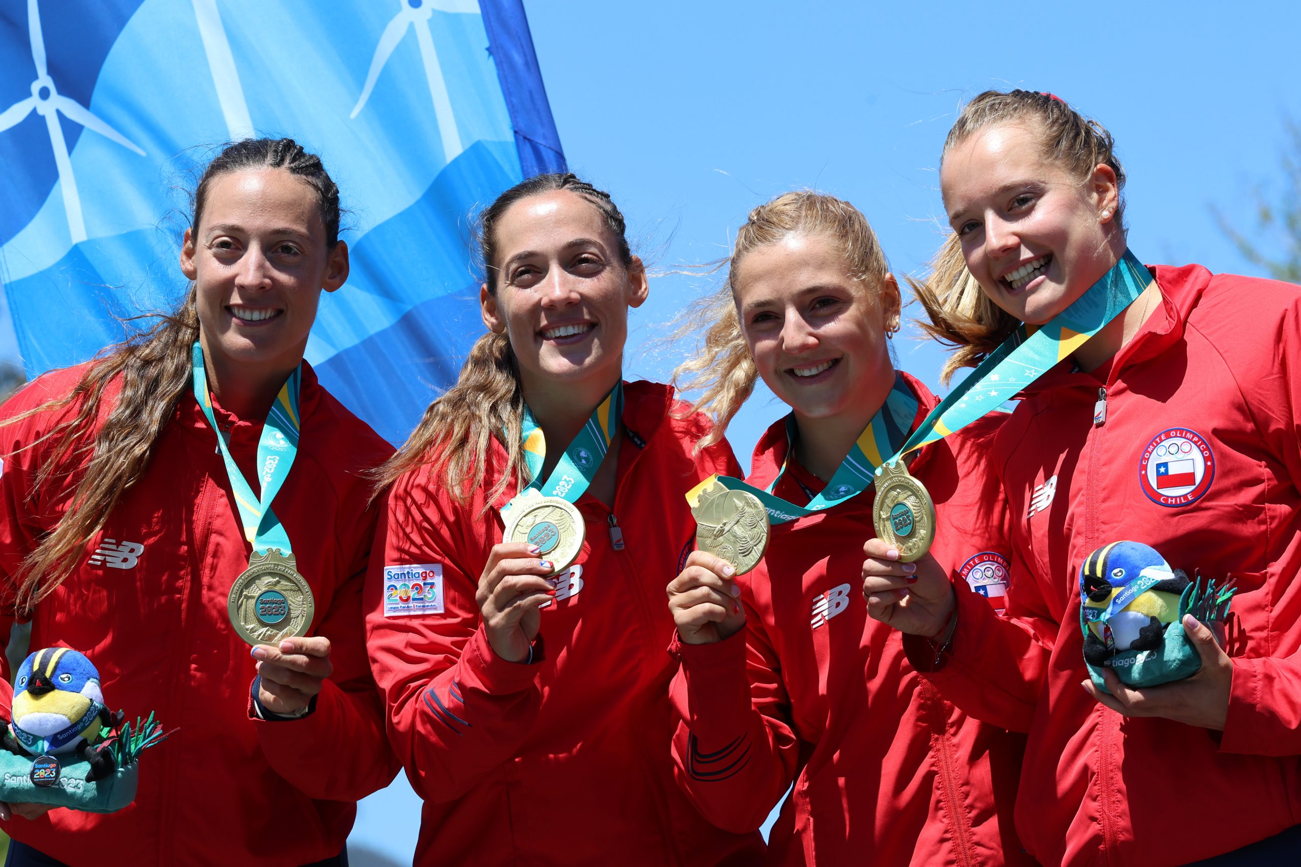 SAN PEDRO DE LA PAZ, CHILE 24 -OCTUBRE- 2023 REMO En la Laguna Grande de San Pedro de la Paz, se realiza la premiación de Remo en los Juegos Panamericanos Santiago 2023, en la Final de la Categoría Cuatro sin timonel femenino. En la foto aparece el equipo de Chile (Abraham/Abraham/Hostetter/Mannig), ganadores de la medalla de Oro (Carlos Acuña/PHOTOSPORT