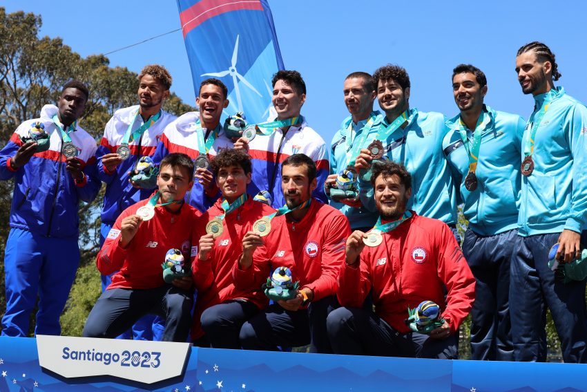 SAN PEDRO DE LA PAZ, CHILE 24 -OCTUBRE- 2023 REMO En la Laguna Grande de San Pedro de la Paz, se realiza la premiación de Remo en los Juegos Panamericanos Santiago 2023, en la Final de la Categoría Cuatro sin timonel Masculino. (Carlos Acuña/PHOTOSPORT